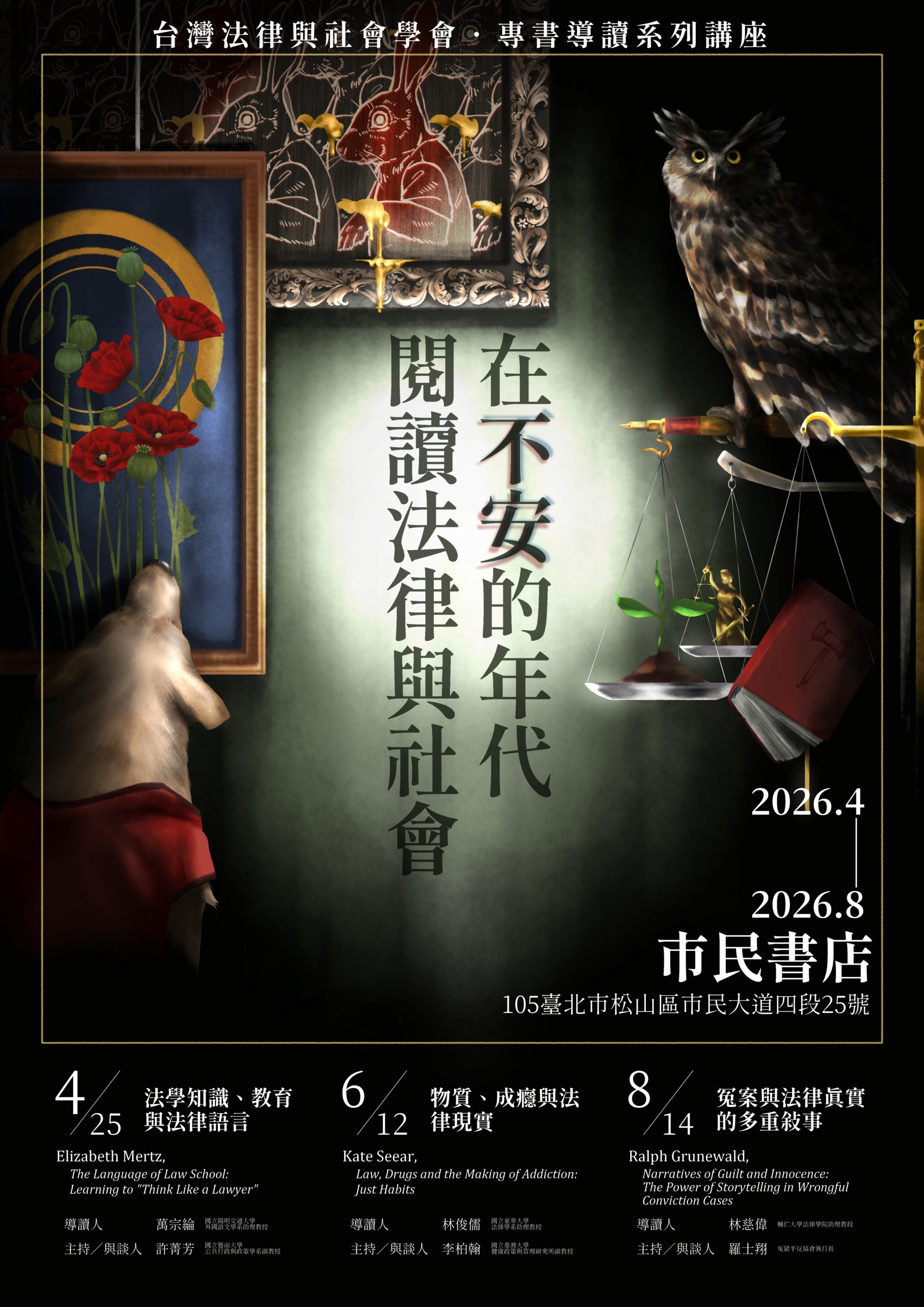 台灣法律與社會學會於 2026 年度將舉辦三場系列講座活動,在每場講座中邀請相關領域專家為讀者導讀一本法律與社會研究的重要著作。本年度導讀講座以「在不安的年代閱讀法律與社會」為主題,期望能透過講座與閱讀,與大家一起在不安的年代思考這些經典之作。從法學知識、成癮治理與冤案敘事等議題切入,反省法律如何透過知識、制度與語言介入社會生活,形塑我們對真實、責任與正義的理解。