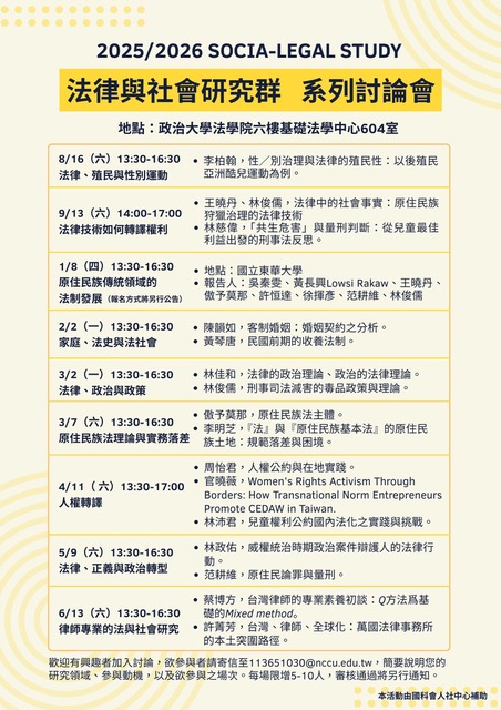 法律與社會研究群系列討論會於2025年夏天陸續登場,共有9場次(16篇主題報告、1場裁判研討),歡迎有興趣加入討論。欲參加者請提供研究動機、研究領域、參與動機、欲參與場次,每場次限增5-10人,寄信至 113651030@nccu.edu.tw ,審核通過將另行通知。