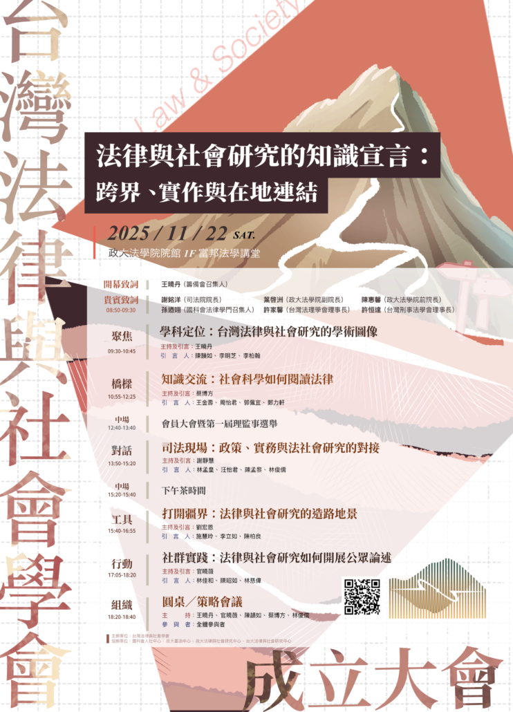 歷經逾半年的籌備,台灣法律與社會學會即將正式成立,並於2025年11月22日(六)於國立政治大學法學院舉辦成立大會暨第一屆年會。地點在四樓的王文杰講堂。