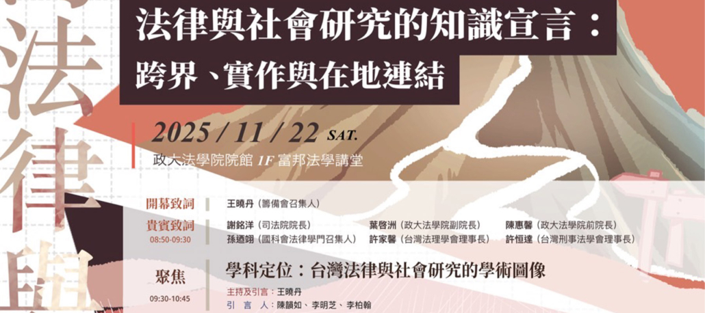 歷經逾半年的籌備,台灣法律與社會學會即將正式成立,並於2025年11月22日(六)於國立政治大學法學院舉辦成立大會暨第一屆年會。地點在四樓的王文杰講堂。